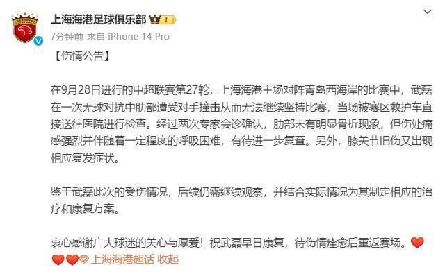 9月30日,上海海港俱乐部发布武磊的伤情公告:经过两次专家会诊确认,武磊肋部未有明显骨折现象,但伤处痛感强烈并伴随着一定程度的呼吸困难,有待进一步复查。另外,膝关节旧伤又出现相应复发症状。