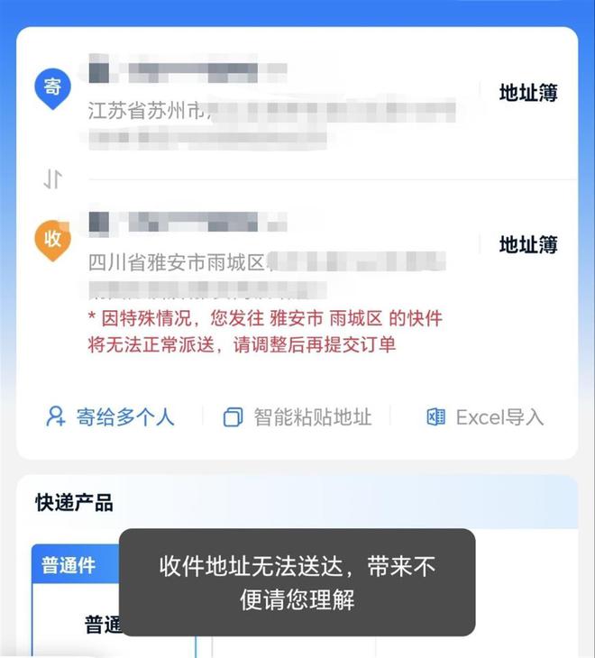 记者注意到,网友反馈的物流异常问题,多与中通快递、圆通速递有关。记者尝试在这两家快递公司的小程序下单,在收件人信息填写雅安雨城区的地址后,却无法提交订单。系统显示:“因特殊情况,该快件将无法正常派送,请调整后再提交订单。”“因特殊原因,暂时无法提供收件服务,建议您暂缓寄出。”“受不可抗力因素影响,您的收件地址无法支持派送”“受不可抗力因素影响,您的订单暂时无法揽收”……