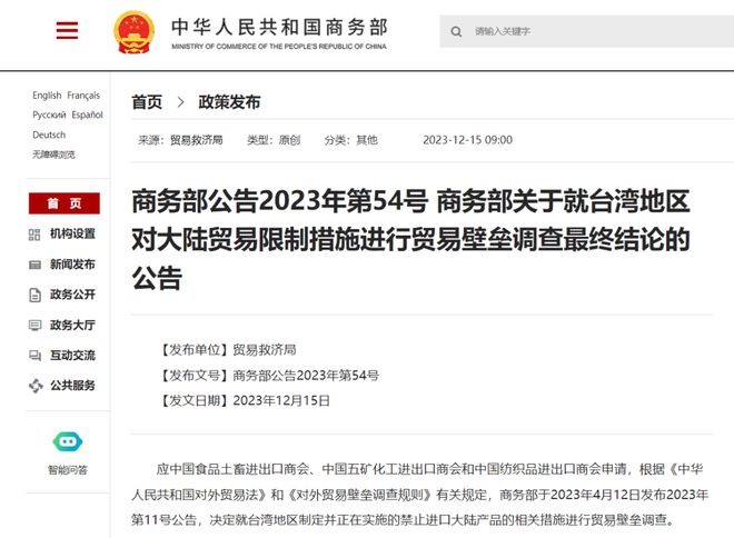 台湾地区经济主管部门回应被商务部附件直接“打脸”