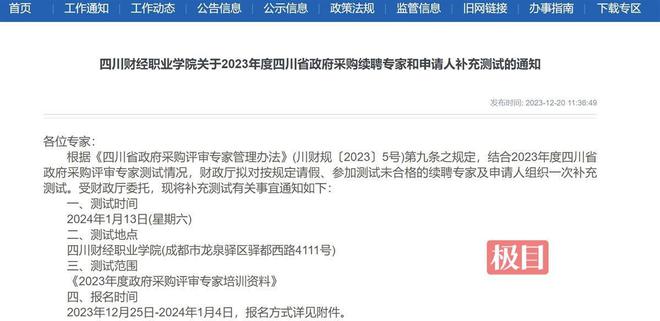 补充测试公告写道:根据《四川省政府采购评审专家管理办法》(川财规〔2023〕5号)第九条之规定,结合2023年度四川省政府采购评审专家测试情况,财政厅拟对按规定请假、参加测试未合格的续聘专家及申请人组织一次补充测试。