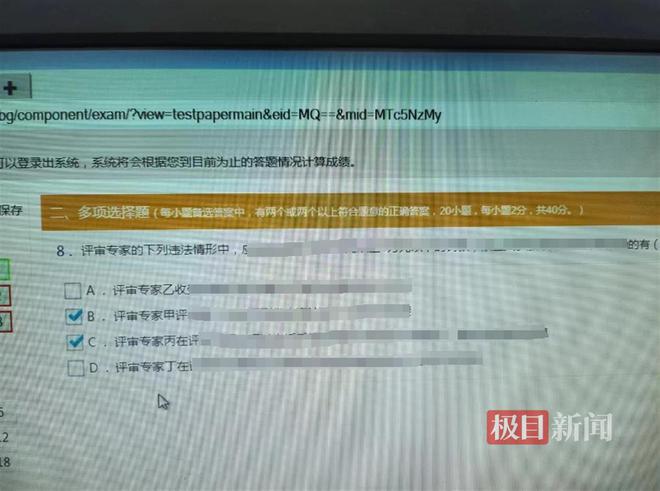 周辉向记者提供了多张疑似泄题的照片。其中一张照片拍摄的电脑页面显示,为多选题第8题,页面左侧还显示有数字编号,部分编号上显示有红框。除电脑页面外,这张照片还拍摄到了两位监考老师的上半身。