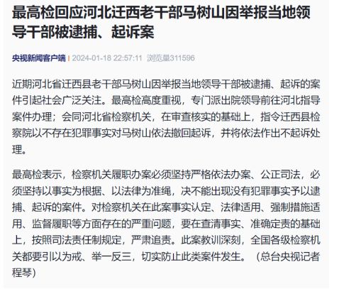 1月18日晚,最高检就马树山因举报当地领导干部被逮捕、起诉作出回应:近期河北省迁西县老干部马树山因举报当地领导干部被逮捕、起诉的案件引起社会广泛关注。最高检高度重视,专门派出院领导前往河北指导案件办理;会同河北省检察机关,在审查核实的基础上,指令迁西县检察院以不存在犯罪事实对马树山依法撤回起诉,并将依法作出不起诉处理。