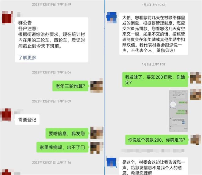 视频显示,在显示有175人的小辛庄联络群里,2023年12月19日上午9点27分,有人发布了一份群公告,统计村内在使用的三轮车、四轮车,要求来村委会进行登记。当天16点04分,王先生询问了一条消息“老年三轮也算?”,对方表示“需要登记”后,王先生又回复了两句话,“要啥信息,我发你”、“家里养病呢,出不了门”。