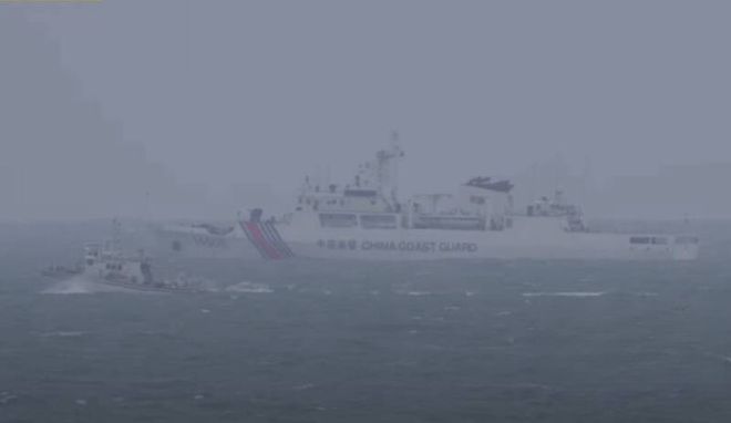 台湾海巡艇在风浪中与4艘大陆海警船“并行”