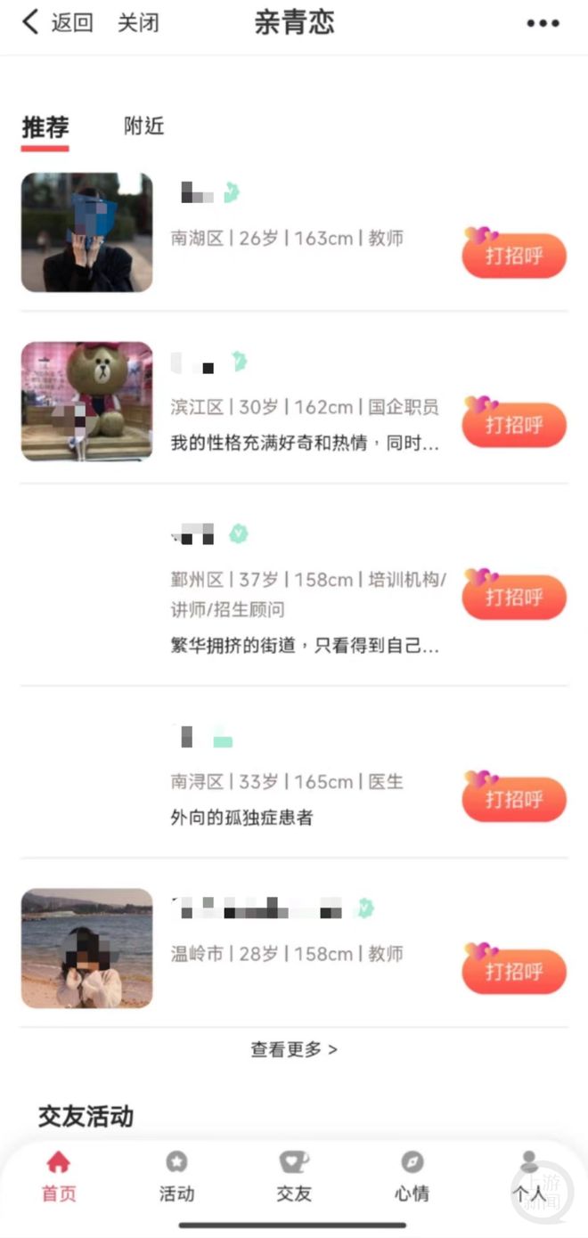 据官网介绍,浙江政务服务网是由浙江省人民政府办公厅主办的网上政务平台,"浙里办"则是基于浙江政务服务网一体化平台能力的APP 。6日,记者下载"浙里办"APP后发现, "浙里办"相亲的功能叫"亲青恋",打开APP后点开"浙里青年"版块就能看到。进入"亲青恋"后,一共分为8个分区,包括"每日速配""爱情会客厅""爱情地图""活动基地""活动照片"等。在下面的"推荐"栏目中,就能看到参与相亲交友的用户,所在区域、年龄、身高、职业、照片等信息一目了然。用户分布涵盖浙江省各地,年龄以二三十岁为主,职业包括公务员、教师、医生、互联网工作人员等。