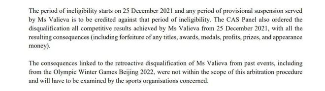 国际体育仲裁法庭在声明中表示,本次事件起因要追溯到2021年12月25日。彼时,瓦利耶娃在俄罗斯参加比赛期间所提供的检测样本呈阳性。她因此被禁赛四年,同时取消2021年12月25日至今的比赛成绩。