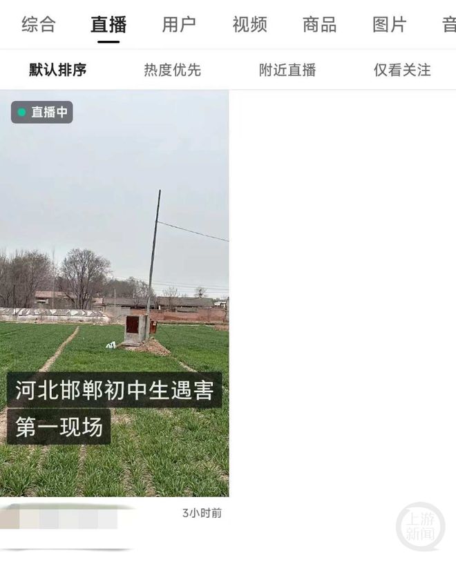上游新闻记者看到,上午10时40分,快手平台一自媒体博主正在直播,镜头对着一片农田,远处是一些民居。视频封面字幕,号称"河北邯郸初中生遇害第一现场",直播时博主本人没有露面,只是偶尔说一两句。在回答网民提问时,他表示这不是现场,是"小孩(住)的村庄"。