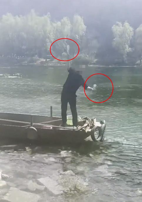 图为男子敲碎玻璃瓶后往河里扔