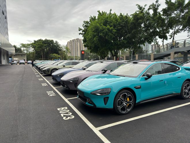 财联社记者走访的深圳小米汽车交付中心位于深圳宝安机场附近。该交付中心毗邻物流公司,停车场内停满了来自深圳周边多个市区的汽车。交付中心也为待交付的小米SU7单独划分了一片区域。该区域内停有创始版、MAX版和标准版等多款小米SU7。