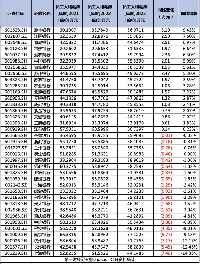 20家银行人均薪酬减少