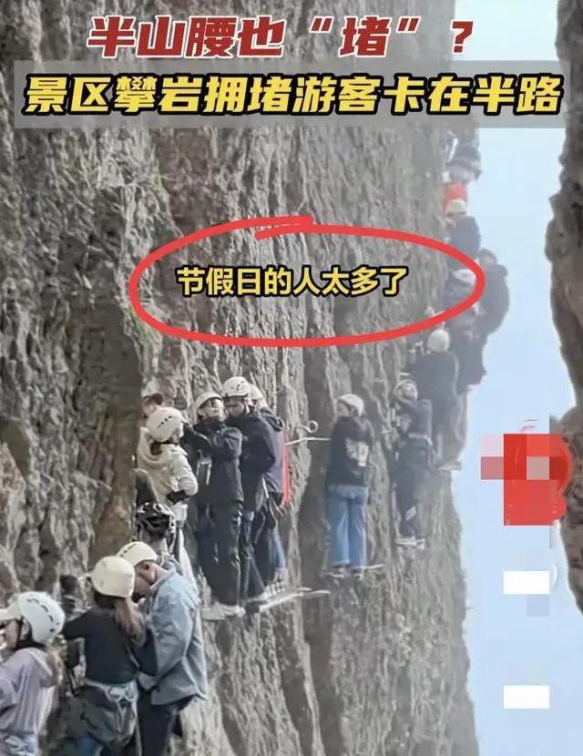 而且景区针对游客被挂在攀岩悬崖的半山腰也做出了回应:一般节假日游客猛增,有的人爬的慢,或者停下来拍照,就会导致堵的情况,景区已经在限流了。