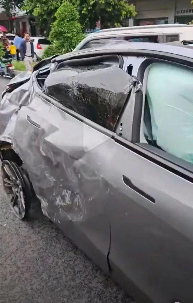涉事特斯拉前保险杠不知所踪,车顶近乎完全塌陷