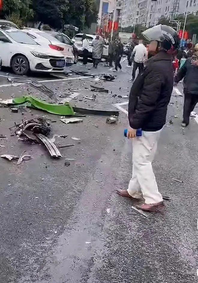 现场到处散落着被撞飞的汽车保险杠、车身零部件