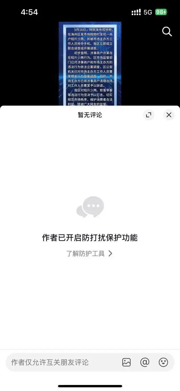 值得注意的是,截至发稿,“连云港发布”“连云港文旅”等多个连云港市官方抖音账号均开启了“防打扰保护功能”,账号主体仅允许自己或者互关的朋友评论,普通网友无法在相关账号下发布评论。