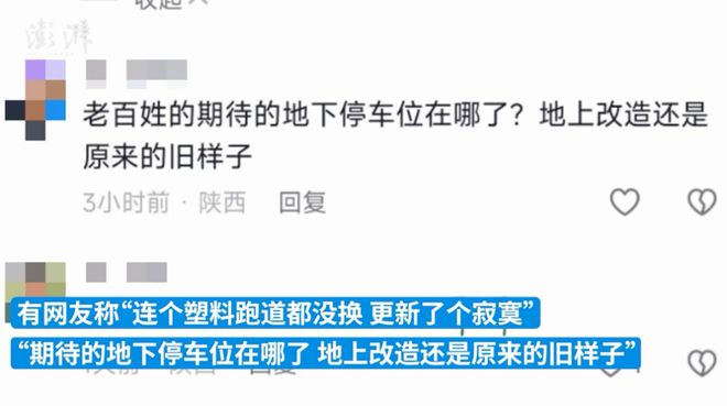 据澎湃新闻报道,有网友称“连个塑料跑道都没换,更新了个寂寞”“期待的地下停车位在哪了,地上改造还是原来的旧样子”,还有网友表示,“操场跑道是以前的,草坪也是以前的,将近七千万开玩笑”“和之前有区别吗”。