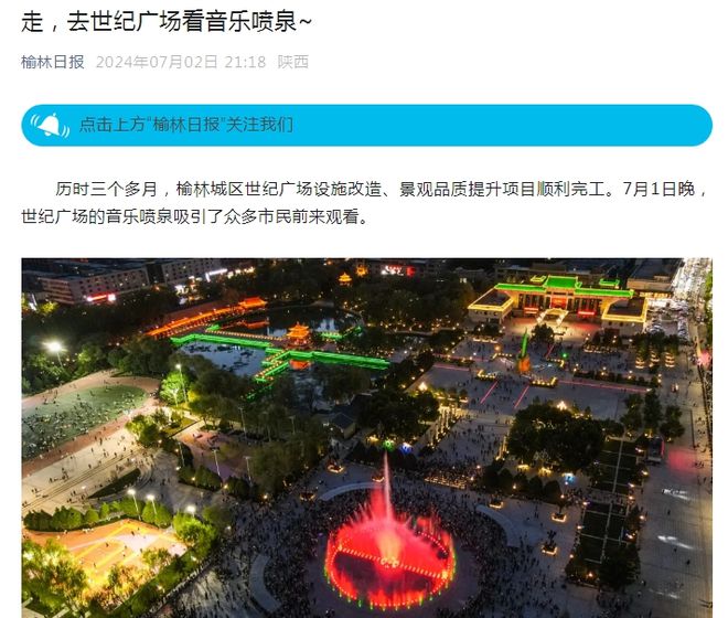 据榆林日报7月2日报道,历时三个多月,榆林城区世纪广场设施改造、景观品质提升项目顺利完工。7月1日晚,世纪广场的音乐喷泉吸引了众多市民前来观看。该项目建设范围东至新建路、南至钟楼巷、西至长城路、北至军分区南围墙,总占地面积约为126326平方米(约189.5亩),此次提升更新主要分为五部分:活力运动区景观提升、活力中轴区景观提升、中轴文化区景观提升、景观文化区景观提升与园区内基础设施提升。