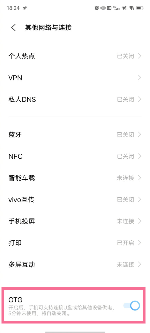 2、打开【OTG】右侧开关。通过OTG线将手机与U盘等设备连接即可。